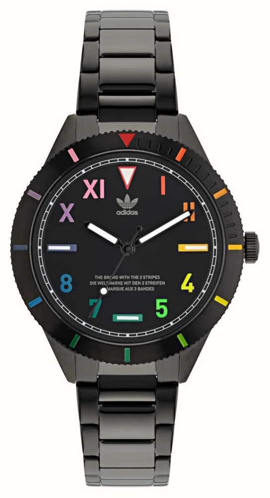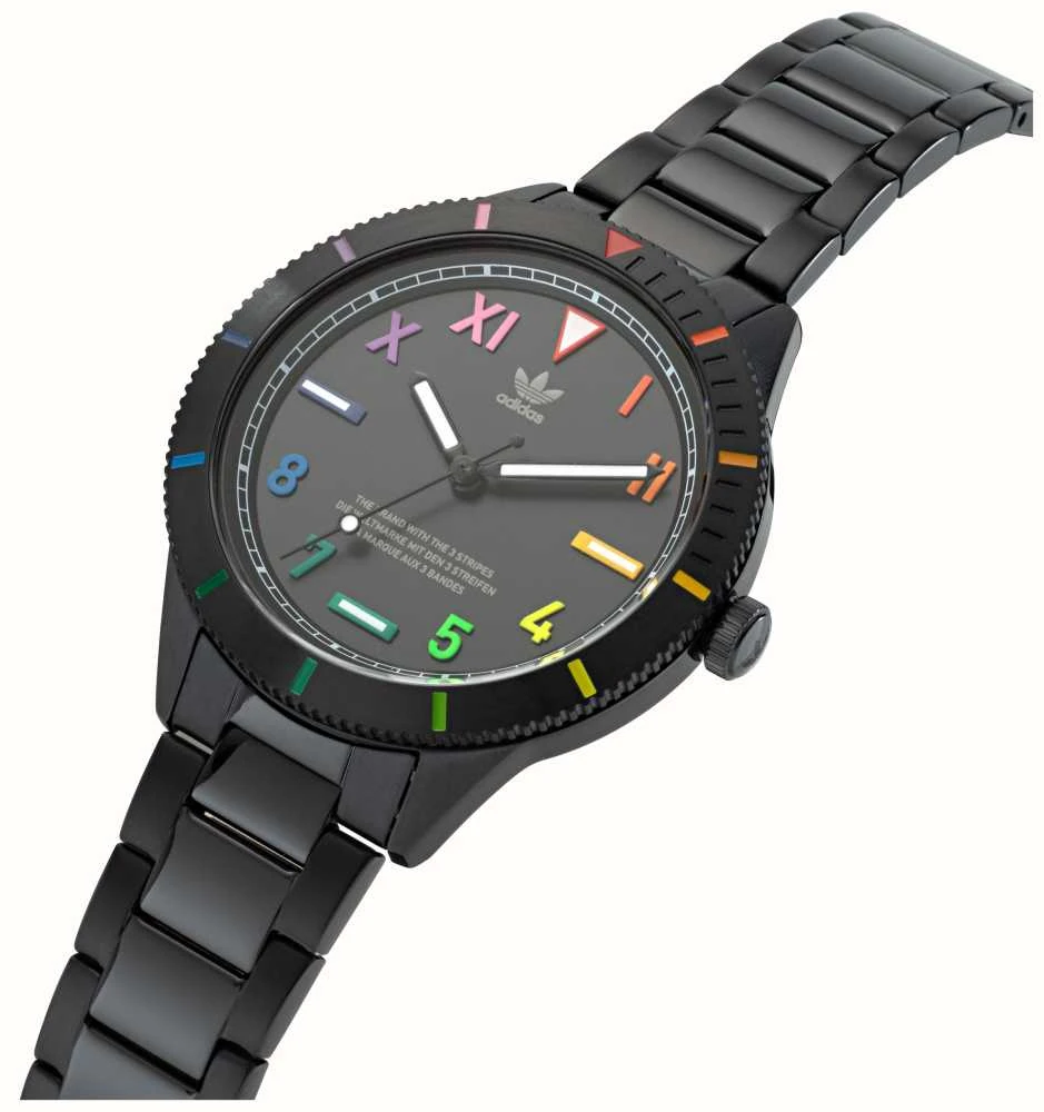 - The dial exhibits rainbow baton and Arabic numeral indices with black hour, minute and second hands.
