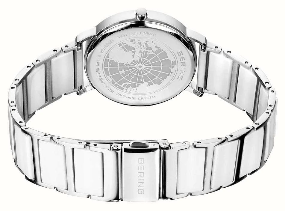 - This watch is finished with a bracelet that is comprised of silver stainless steel and white ceramic links.Â