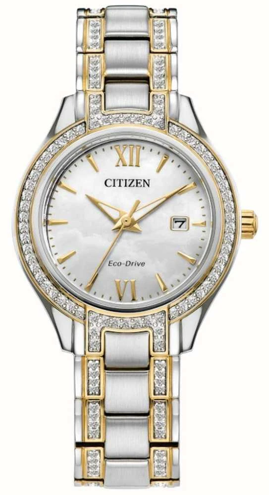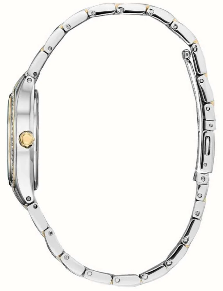 - A two-tone gold and silver crystal-set stainless steel bracelet secures the watch on the wrist.Â