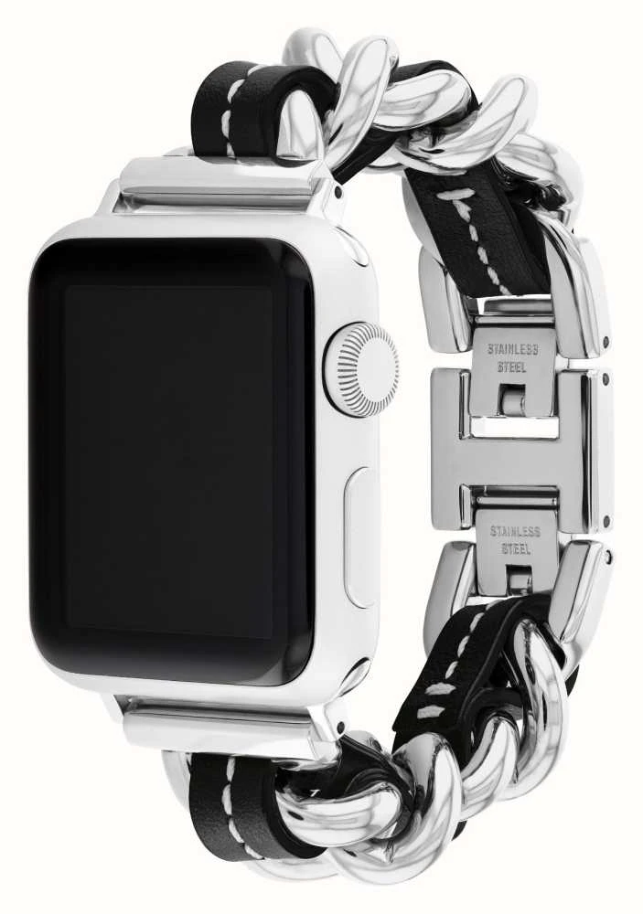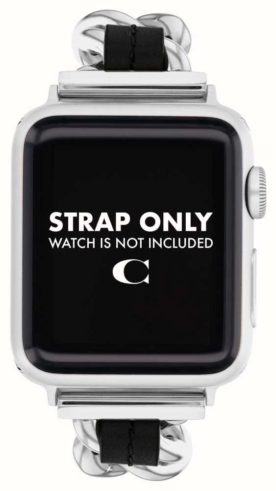 - This Coach Apple Watch strap is made from stainless steel and black leather.