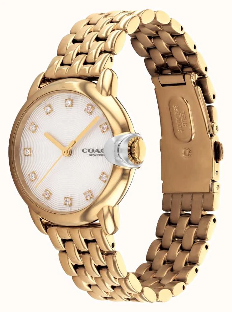 - The watch is finished with a gold ion plated stainless steel bracelet that fastens with a deployment clasp.
