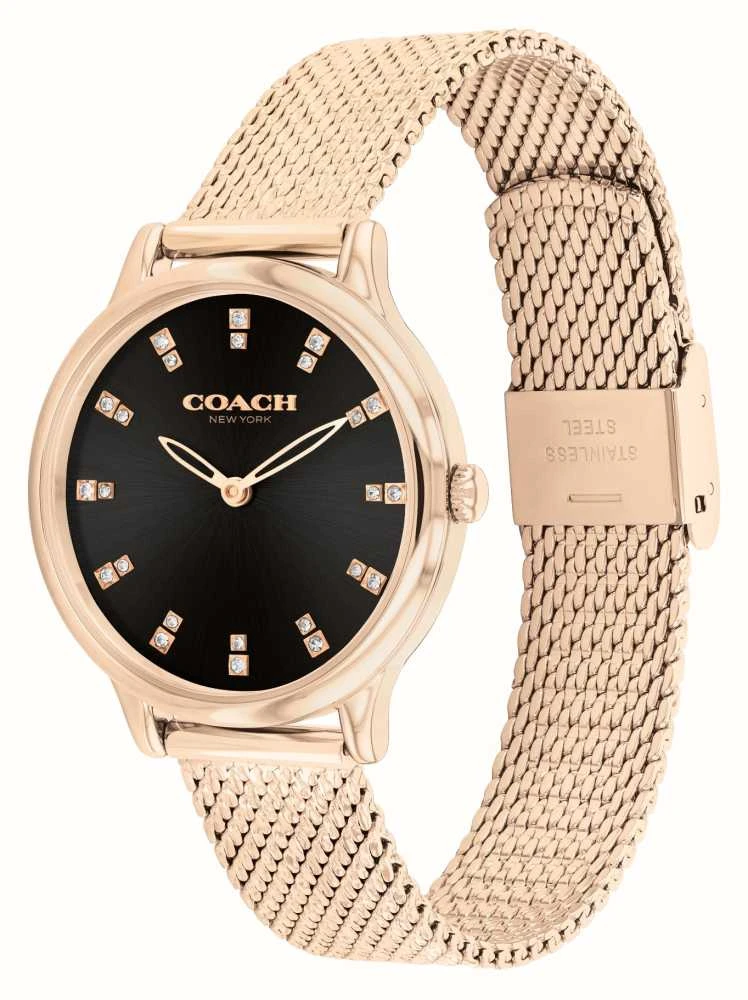 - The watch is finished with a rose gold-tone stainless steel mesh bracelet.