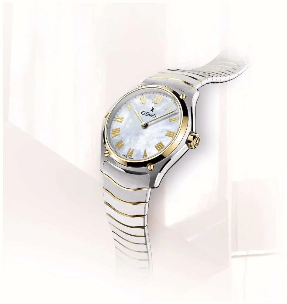 - The bracelet features EBEL’s iconic wave-shaped tapered links.