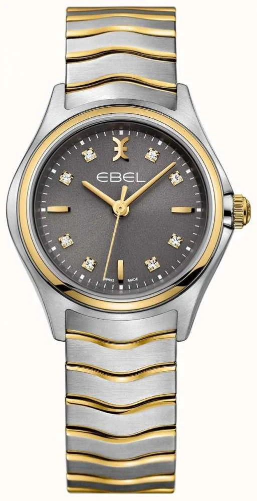 - 8 diamonds have been set into the dial. The diamonds act as replacements for some of the indices. The hour markers at 3, 6 and 9 o’clock are thin gold-coloured indices. A gold-coloured EBEL logo features at the 12 o’clock position.Â