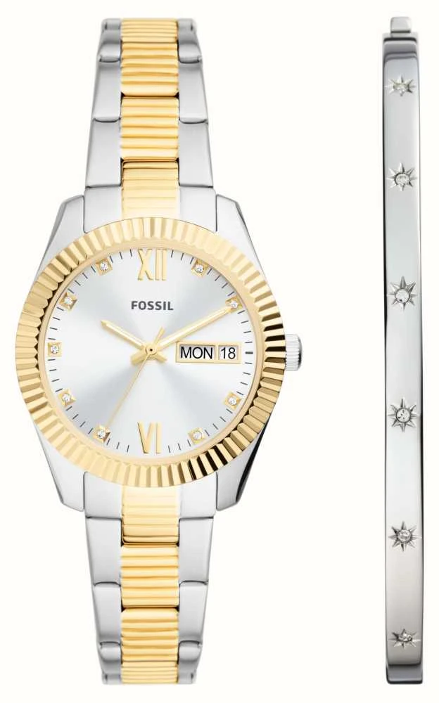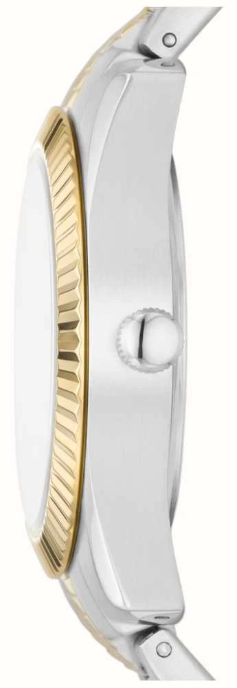 - The watch is secured on the wrist using a two-tone gold and silver stainless steel bracelet.