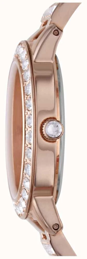 - The watch is secured on the wrist using a crystal-set rose gold stainless steel bracelet.