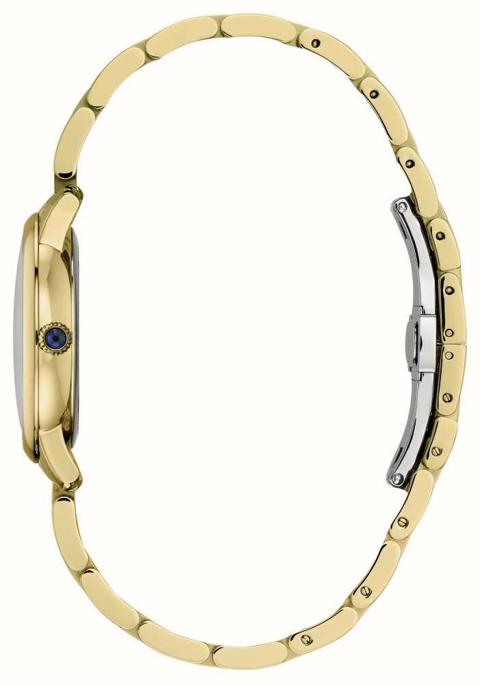 - Securing the watch is a yellow gold-plated 7-link stainless steel bracelet.