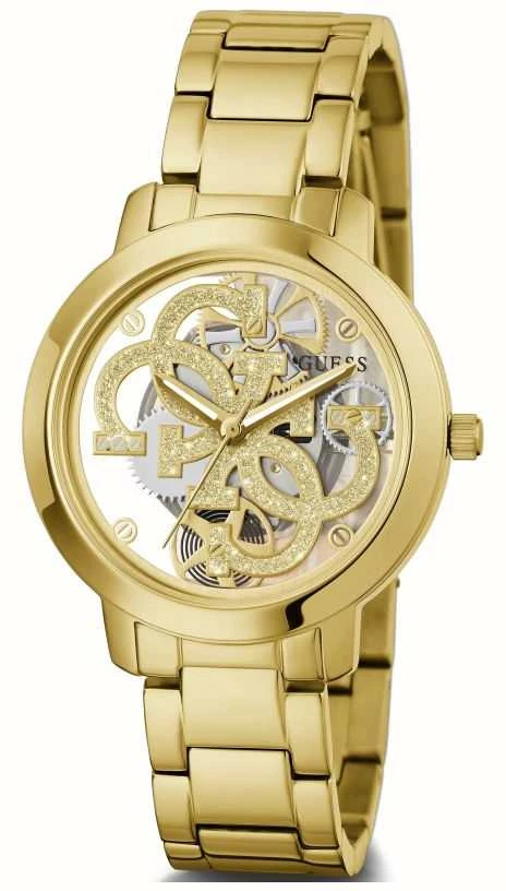 - This model features a transparent dial that features the iconic Guess ‘4 G’ logo.
