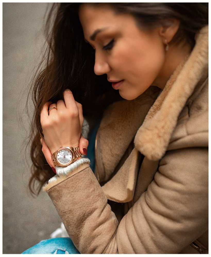 - Framing the dial is a rose gold-tone fluted bezel.