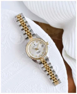 - Securing the watch to the wrist is a gold-tone stainless steel bracelet that fastens with a deployment clasp.