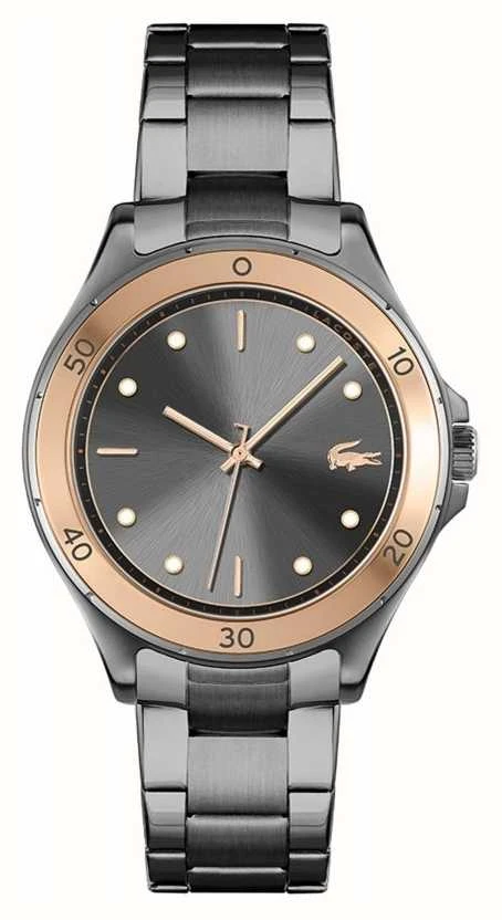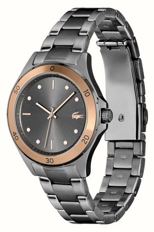 - This watch features a grey dial with gold hands and indices and the Lacoste crocodile at 3 o’clock.
