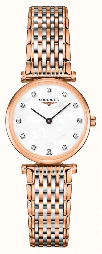 - The mother of pearl dial is complemented by sleek black baton hands. The dial is diamond-set, with 12 diamonds replacing the indices.