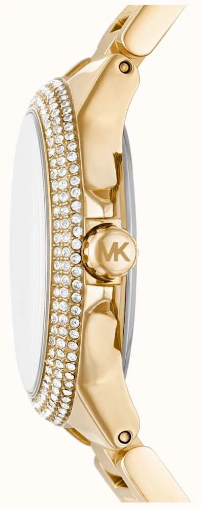 - Securing the watch is a yellow-gold toned crystal set stainless steel bracelet.
