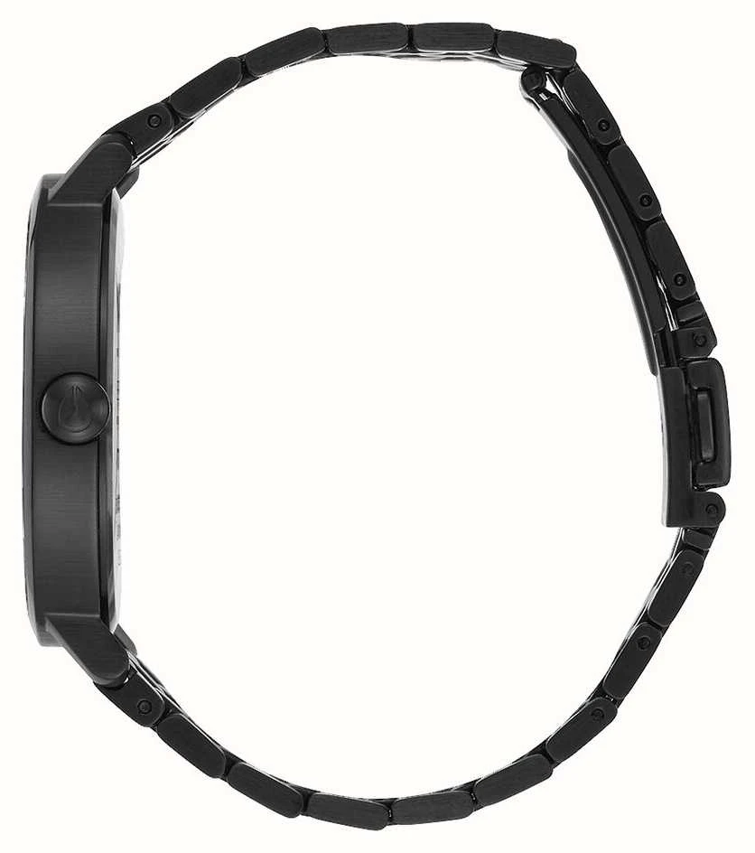 - Securing the watch is a black IP plated stainless steel bracelet.