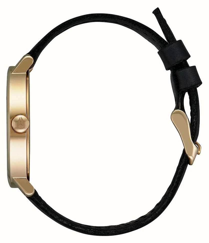 - Securing the watch is a black leather strap.Â