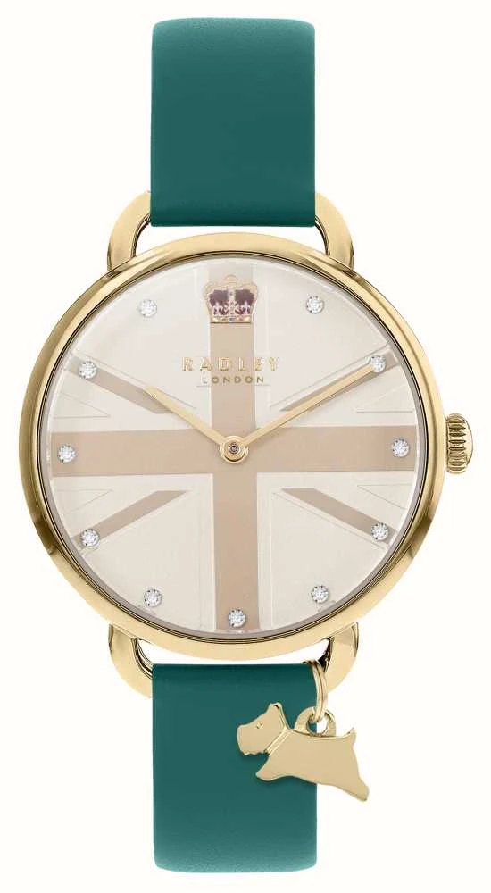 - The dial features a Union Jack flag design with a crown emblem at 12 o’clock.Â
