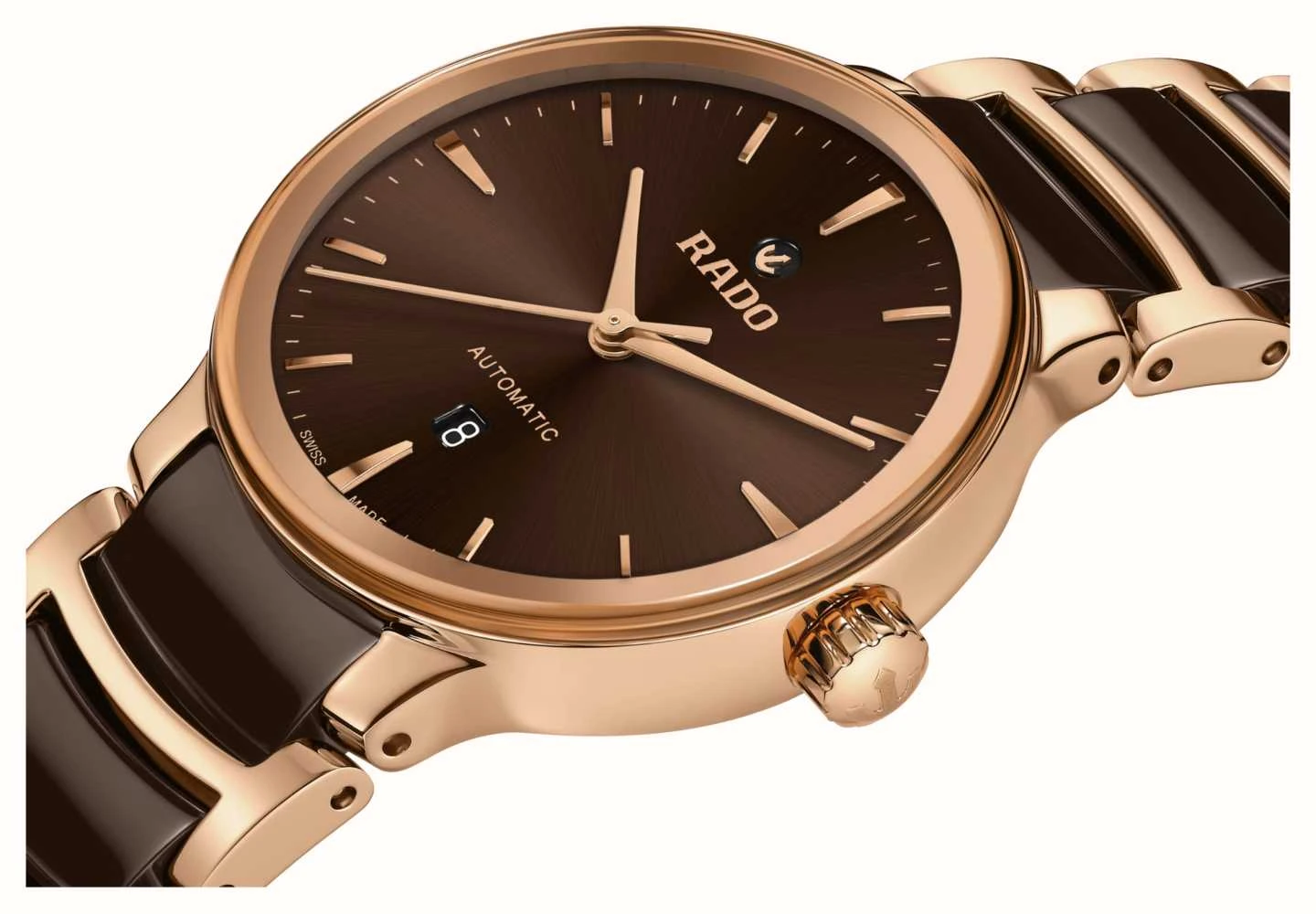 - A bracelet made from brown high-tech ceramic and rose gold-tone stainless steel secures the watch on the wrist.Â