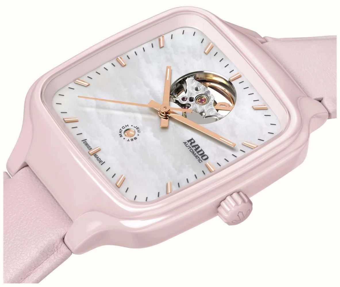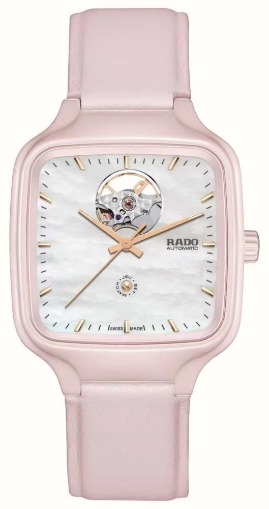 - The pink square case retains the easily recognizable Rado silhouette. It is made of high-tech ceramic and stainless steel.
