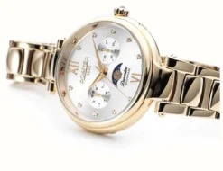 - The dial is framed by a stainless steel case and a gold bezel. The case measures 32mm in diameter.
