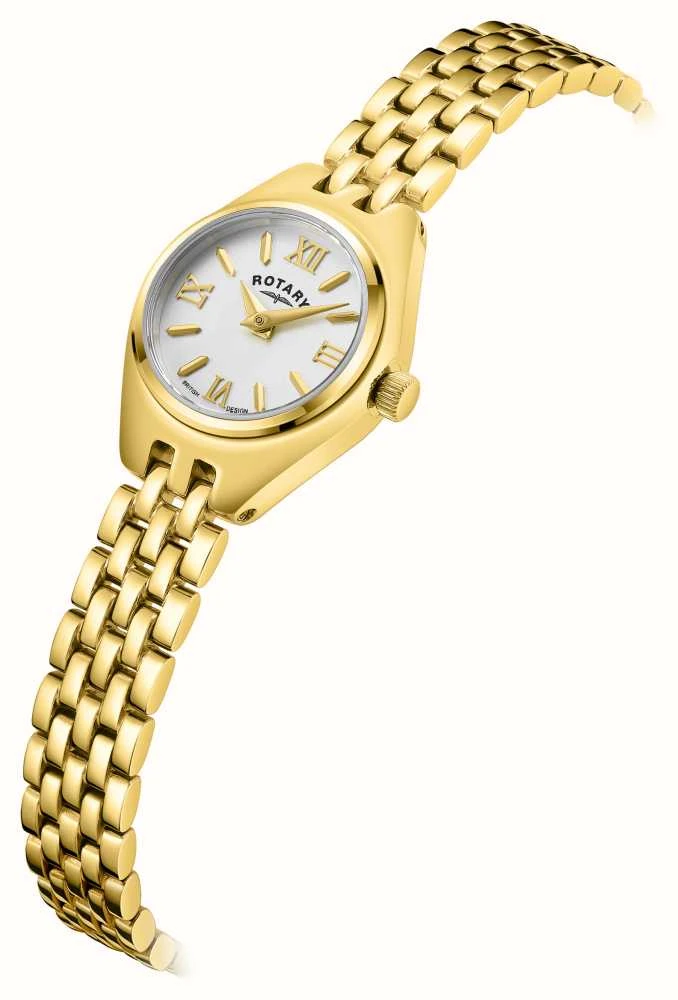 - This watch features a white dial that is adorned with gold baton indices, gold Roman numerals and gold hour and minute hands.