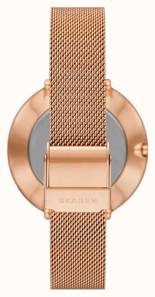 - Securing the watch is a rose gold Milanese mesh stainless steel bracelet.