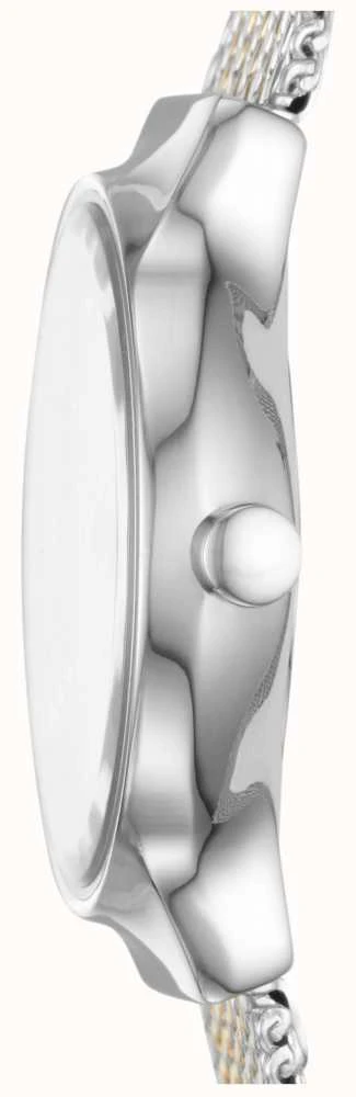 - Securing the watch is a dual-tone silver and gold Milanese mesh stainless steel bracelet.