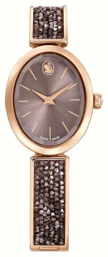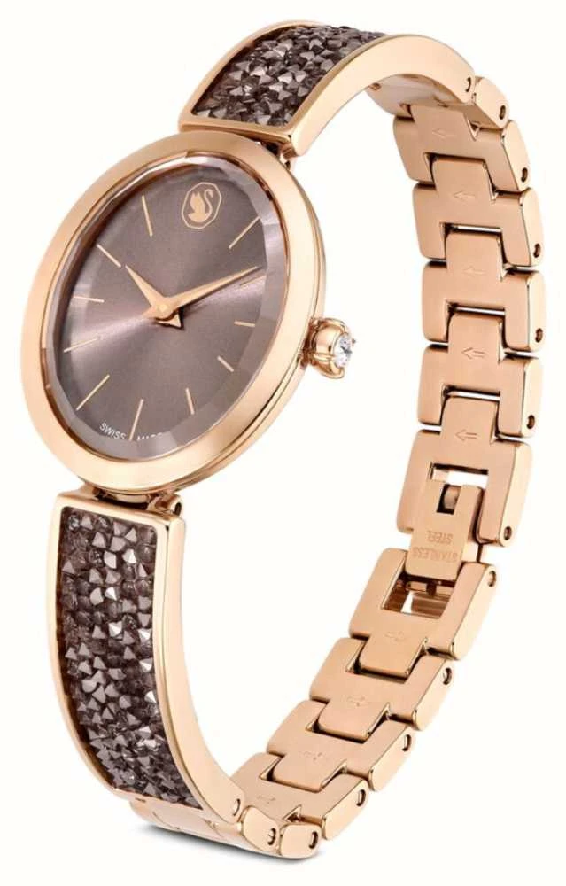 - Securing the watch to the wrist is a rose gold-tone bracelet which is set with brown crystals on its exterior.