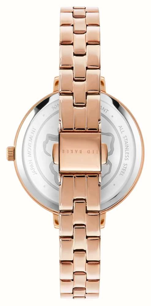 - A rose gold-tone stainless steel bracelet secures the watch on the wrist.