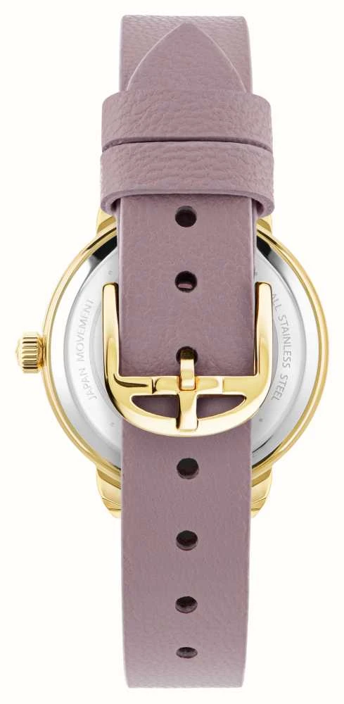 - A lilac leather strap secures the watch on the wrist.Â