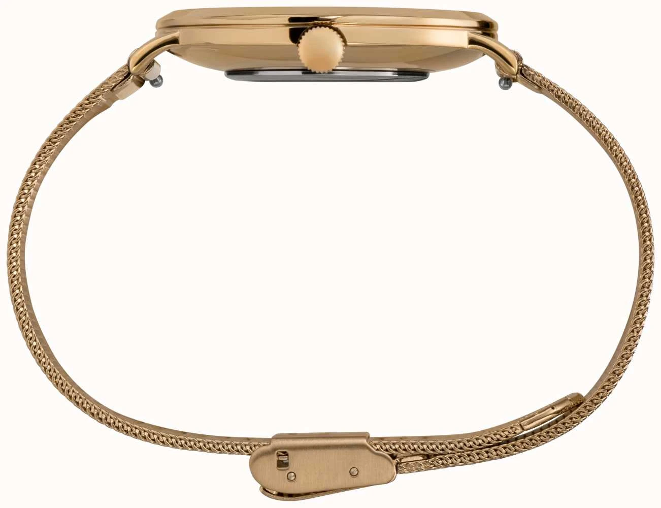 - The watch is finished with a gold-tone metal mesh bracelet.