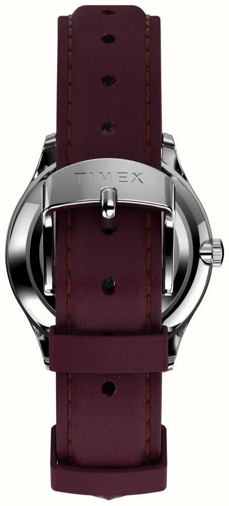 - The watch is finished with a burgundy leather strap.