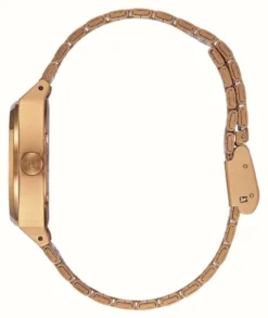 - A gold PVD-platedĀ stainless steel braceletĀ secures the watch to the wrist.Ā