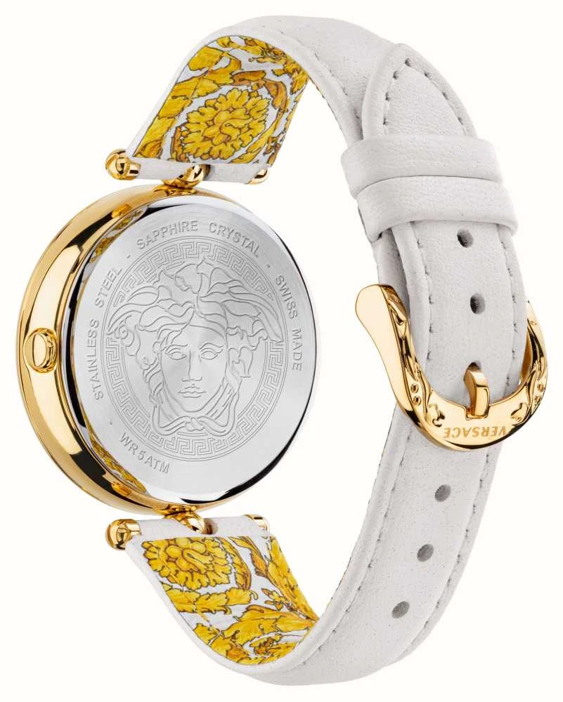 - AĀ white leather strapĀ secures the watch to the wrist.