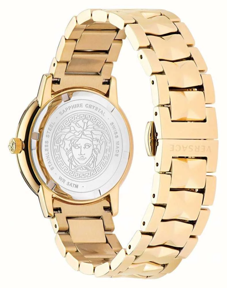 - A gold PVD-plated stainless steel bracelet secures the watch to the wrist.
