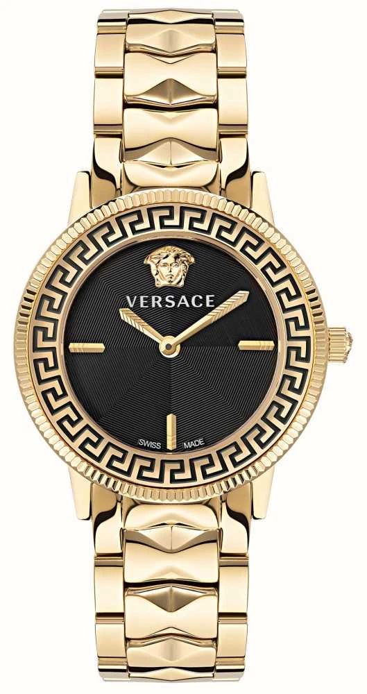 - Framing the dial is a gold-tone Greek key pattern bezel.Â